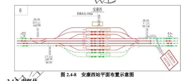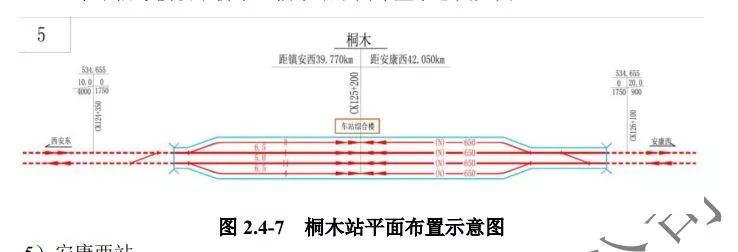 車站初始規(guī)3臺8線布置,遠(yuǎn)期隨天水一十堰鐵路引入預(yù)留1臺2線(PS:另一條高鐵過境安康,美),總規(guī)模4臺10線。到發(fā)線有效長650m,設(shè)島式站臺(450×12×1.25m)4座,設(shè)旅客進(jìn)出站地道2座(寬12m)。