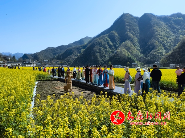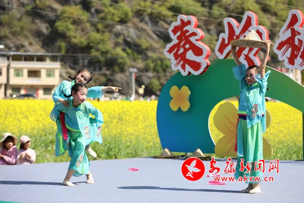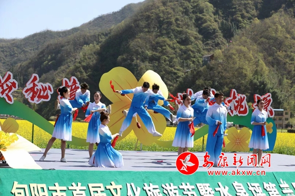 活動現(xiàn)場,旬陽市仁河口鎮(zhèn)水泉坪景區(qū)萬畝油菜花海在陽光照耀下嬌俏迷人,和煦春風(fēng)拂面而來,花海泛起層層疊疊的金色浪潮,濃郁的花香令人沉醉,絡(luò)繹不絕的觀眾和游客不時駐足拍照。精彩的文藝演出更是輪番上演,歌曲《油菜花開了》《旬陽人》、表演唱《庭院經(jīng)濟(jì)富農(nóng)家》、舞蹈《盛世花開》《家鄉(xiāng)的油菜花》《春頌》、嗩吶獨奏《百鳥朝鳳》、音樂快板《紅色傳承譜華章》、大筒子小戲《勸賭》等節(jié)目,讓觀眾目不暇接、贊不絕口,為景區(qū)增添了文化內(nèi)涵、營造了藝術(shù)氛圍、給繁花似錦的油菜花海注入了生機(jī)活力。