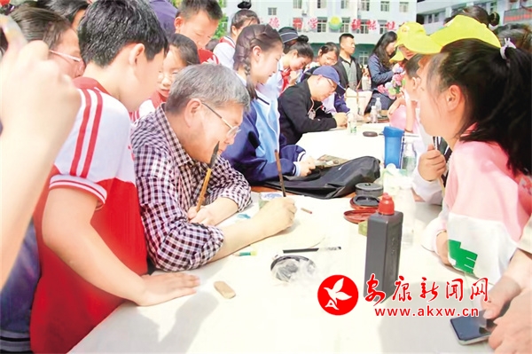 4月20日,白河縣城關(guān)小學(xué)舉辦讀書節(jié)活動,縣文聯(lián)書法家為孩子們書寫書簽。陳華 攝3sD安康新聞網(wǎng)