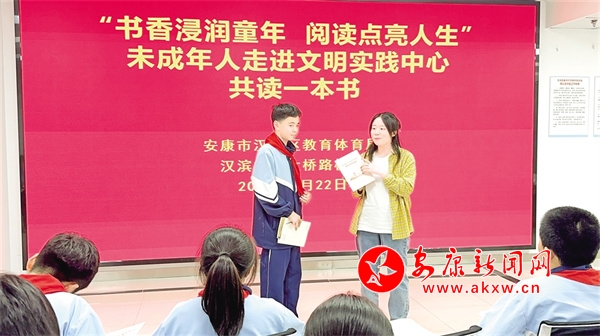 4月22日,漢濱初中大橋路校區(qū)學(xué)生走進漢濱區(qū)新時代文明實踐中心,開展“書香浸潤童年,閱讀點亮人生”共讀一本書活動。吳亞君 攝3sD安康新聞網(wǎng)