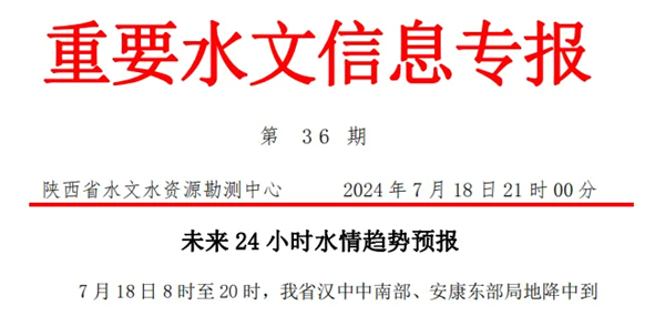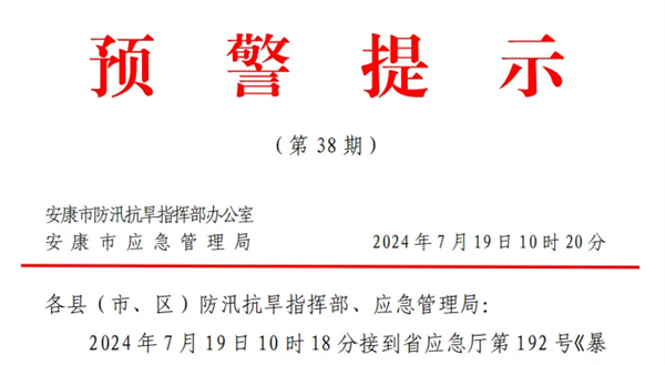 2024年7月19日10時18分接到省應急廳第192號《暴雨橙色預警》:預計未來3小時我市漢濱區(qū)、寧陜縣降雨量將達50 毫米以上,未來6小時我市漢陰縣、石泉縣、旬陽市、白河縣將達50毫米以上,以上地區(qū)境內發(fā)生山洪、泥石流等災害風險較高。