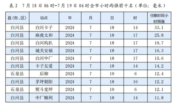 2024年7月18日白天我市大部出現陣雨天氣,19日05時起我市西部出現較強降水天氣。據統計,2024年7月18日06時至7月19日06時安康市平均雨量為6.1毫米,其中單站雨量最大為白河卡子氣象監(jiān)測站48.4毫米,縣市平均雨量最大為白河縣15.3毫米,最大小時雨強出現在白河卡子氣象監(jiān)測站33.1毫米(18日13時-14時)。全市共有235個站出現了降雨(大于0.1毫米),10毫米(中雨)以上有41站,25毫米(大雨)以上有8站。共有16站次小時雨強超過10毫米,2站次小時雨強超過20毫米。