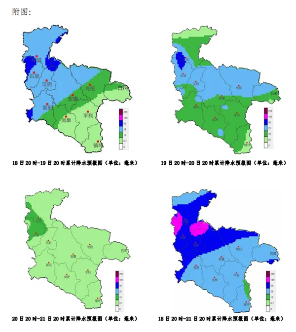 18后半夜至19日白天:小雨轉中雨,中北部、西部(寧陜、石泉、漢陰、紫陽、漢濱中北部、旬陽北部)大雨,局地暴雨。