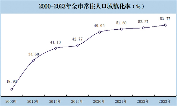 城鎮(zhèn)化步伐明顯加快。1949年,安康總?cè)丝?46.75萬人,其中農(nóng)業(yè)人口占89.4%,屬于典型傳統(tǒng)的農(nóng)村社會(huì),交通不便,人員相對封閉不流動(dòng)。改革開放后,市場經(jīng)濟(jì)體制逐步建立,特別是2000年撤地設(shè)市,對安康具有劃時(shí)代和里程碑的意義。2021年旬陽撤縣設(shè)市,成為陜南首個(gè)縣級市,標(biāo)志著全市城鎮(zhèn)化步伐邁向更高水平。全市抓住東部勞動(dòng)密集型產(chǎn)業(yè)向中西部轉(zhuǎn)移的機(jī)遇,依托易地搬遷集中安置點(diǎn),大力興辦新社區(qū)工廠,把農(nóng)民變?yōu)榫用,大力開展新環(huán)境、新服務(wù)、新產(chǎn)業(yè)、新民風(fēng)、新生活“五新”社區(qū)創(chuàng)建工作,完善配套設(shè)施,健全服務(wù)體系,城鎮(zhèn)化建設(shè)步伐顯著加快。2023年,全市戶籍人口300.75萬人,常住人口245.72萬人。常住人口城鎮(zhèn)化率由2000年的18.9%,提高到2023年的53.77%,23年間提高了34.87個(gè)百分點(diǎn)。