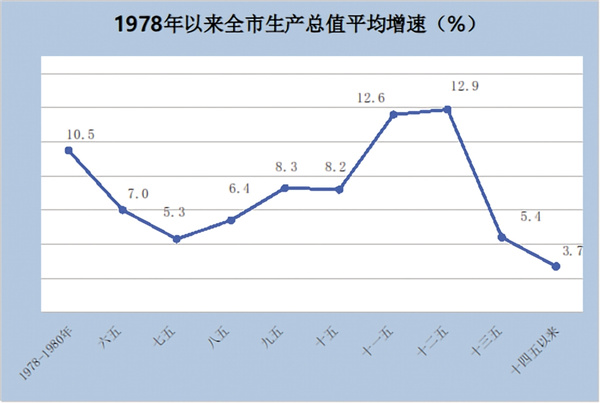 追趕超越步履堅(jiān)實(shí)。從增速看,“六五”到“十五”年均增速為個(gè)位數(shù);“十一五”“十二五”時(shí)期發(fā)展較快,年均增速兩位數(shù),“十三五”年均增長5.4%,“十四五”前三年平均增長3.7%。從具體年份看,2007—2016年連續(xù)10年保持兩位數(shù)增長,其中2012年增長15.2%。自2009年起,全市GDP增速持續(xù)高于全省平均水平,尤其是2015年躍居全省第一,2015—2019年連續(xù)5年保持全省首位,呈后來居上、追趕超越之勢。2020年受疫情沖擊,增速回落至全省第9位,2023年全市經(jīng)濟(jì)平穩(wěn)恢復(fù),增長1.7%,發(fā)展進(jìn)入新常態(tài)。