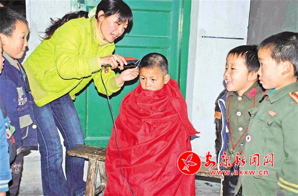 蘭坪小學(xué)老師為學(xué)生理發(fā)。