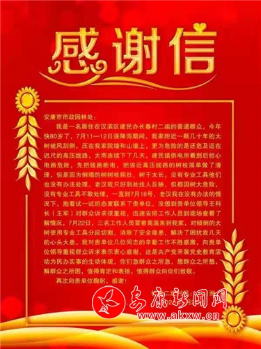 從感謝信中獲知:家住漢濱區(qū)建民辦長春村二組的尤大爺年近八旬,因7月11—12日強降雨導致附近一棵幾十年的大樹被風刮倒,壓在他家院墻和山墻上,更為危險的還危及近在咫尺的高壓線路。供電部門對高壓線路的樹枝做了清理,但因倒塌大樹粗壯,樹干太長,沒有專業(yè)工具處理,仍存在較大安全隱患。老大爺突然想到曾在路邊看到市政人員對行道樹進行修剪,于是抱著試試的心態(tài)撥打了安康市市政園林處電話。接到求助后,該處綠化管護科當天下午派了2名專業(yè)人員趕往現(xiàn)場,對該樹干進行分段切割移除,解決了困擾老大爺?shù)男念^大患。老大爺對市政園林處及時高效辦理群眾煩心事、操心事非常感激,連夜寫信并通過快遞形式寄到市政園林處。一封感謝信只是市政園林處踐行開展黨史學習教育“我為群眾辦實事”主題實踐活動的一個縮影。自黨史學習教育以來,市政園林處以學踐用,以學促干,累計為群眾辦實事11件,扎實推進市政園林項目建設,社區(qū)群眾自發(fā)送來錦旗2面,各級媒體爭相報道。tq6安康新聞網(wǎng)