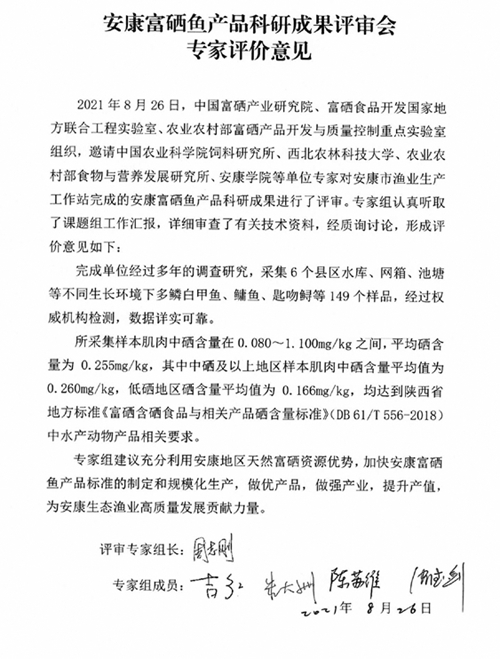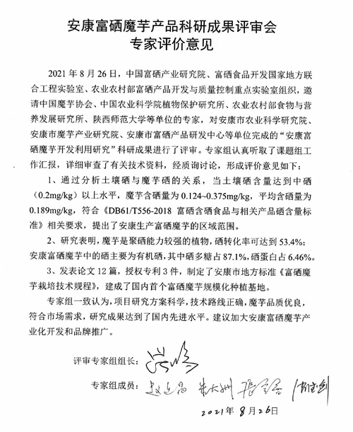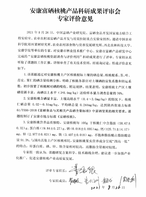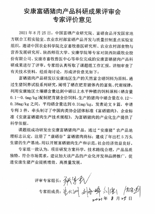 本次評審中,專家組認真聽取了課題組工作匯報,詳細審查了有關技術資料,經質詢討論后一致認為:四大富硒特色產業(yè)課題研發(fā)方案科學、技術路線合理,研究成果達到國內先進水平,天然富硒是安康得天獨厚的資源優(yōu)勢,培育開發(fā)出的產品品質優(yōu)良,符合市場需求。建議充分利用安康地區(qū)天然富硒資源優(yōu)勢,加快富硒特色產業(yè)標準的制定和規(guī);a,做優(yōu)產品、做強產業(yè)、提升產值,加大該產品的產業(yè)化開發(fā)和品牌推廣力度,促進產業(yè)提質增效。