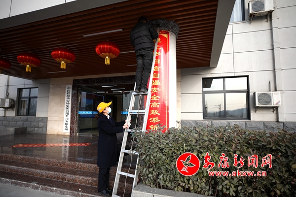 Wfj安康新聞網(wǎng) 圖為該站干部職工在機關(guān)樓下貼春聯(lián)Wfj安康新聞網(wǎng)