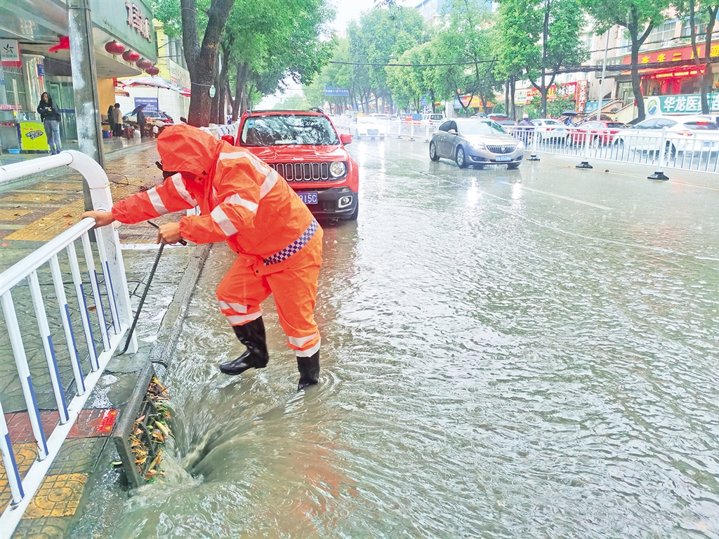 針對持續(xù)中到大雨的嚴(yán)峻形勢,市市政園林處黨委充分發(fā)揮政治功能和組織優(yōu)勢,堅持人民至上、生命至上,城市道橋排水搶險黨員突擊隊得令后,迅速進(jìn)入“戰(zhàn)時”狀態(tài),車輛、人員、裝備分組向著排澇最前沿火速集結(jié)。為在水中尋找更多井口,搶險隊員徒手在臟水中摸尋并清除井蓋上的阻水雜物、撬開井蓋,加快積水排放,以最快的速度排除隱患,全力恢復(fù)城市正常道路交通秩序。一時間,隊員們衣服濕透,雨靴浸水,雨水和汗水交融,揮灑在茫茫雨海。