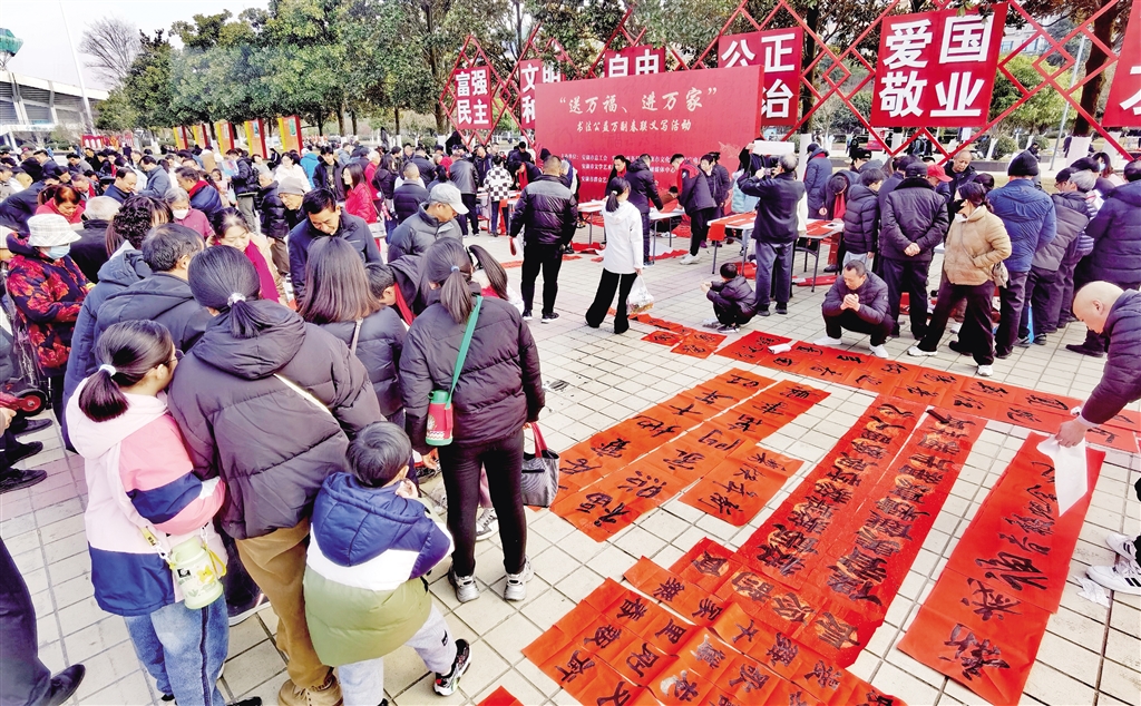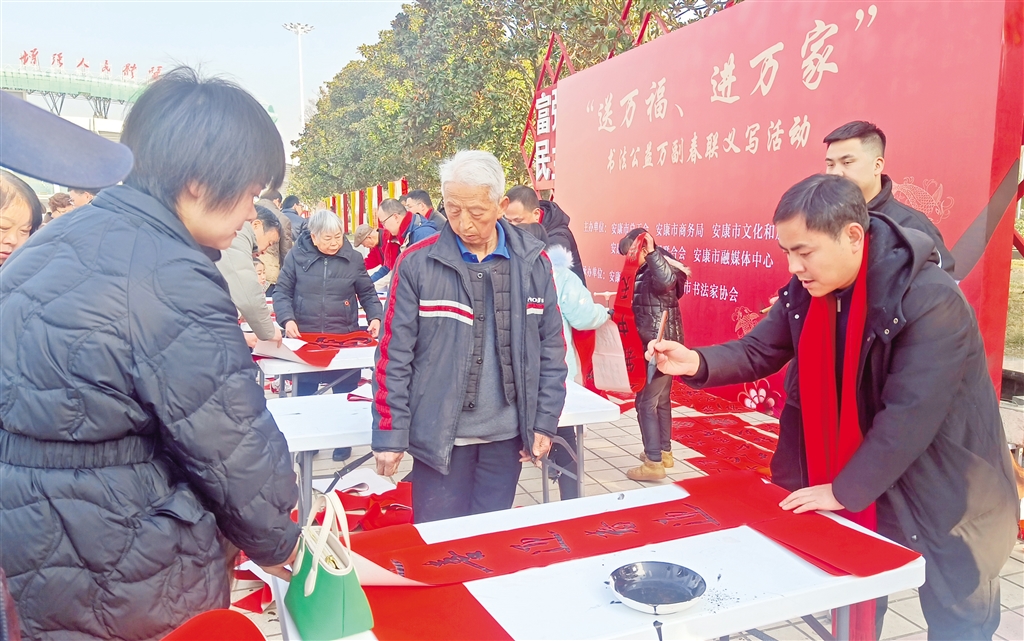 活動現(xiàn)場,人頭攢動,長桌一字?jǐn)[開,書法家們精神飽滿,手中的毛筆飽蘸濃墨,筆鋒游走間,楷、行、隸、草等多種書體各顯神韻,一副副滿載祝福的春聯(lián)、一張張承載希望的“福”字躍然紙上,飽含著濃濃年味兒,寄托著人們對新年的美好憧憬與希望。前來領(lǐng)取春聯(lián)的市民絡(luò)繹不絕,大家一邊欣賞書法創(chuàng)作,一邊挑選著心儀的春聯(lián)內(nèi)容,現(xiàn)場氣氛熱烈融洽;顒舆將在安康高新區(qū)、西城坊、部分旅游景點等地持續(xù)進(jìn)行。(記者 陸青波 攝)