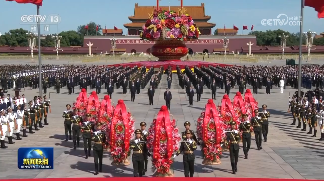 方陣前,以中共中央,全國人大常委會,國務院,全國政協(xié),中央軍委,各民主黨派、全國工商聯(lián)和無黨派愛國人士,各人民團體和各界群眾,老戰(zhàn)士、老同志和烈士親屬,中國少年先鋒隊名義敬獻的9個大型花籃一字排開,花籃紅色緞帶上書寫的“人民英雄永垂不朽”格外醒目。