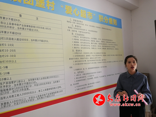 今年4月29日,61歲的田遠(yuǎn)樹和丈夫一起來到愛心超市,兌換了大米和消毒液,她說:“我們表現(xiàn)好,就能兌換積分拿東西,政策好啊”。原來,他們一家種茶、養(yǎng)蜂、養(yǎng)豬、養(yǎng)雞,因為產(chǎn)業(yè)發(fā)展的好,積分就高,后來田遠(yuǎn)樹被村里評為好媳婦,又有了加分項目。