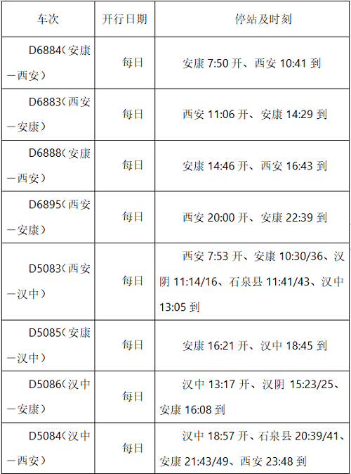 每日常態(tài)化動(dòng)車開行車次、日期、停站及時(shí)刻信息如下: