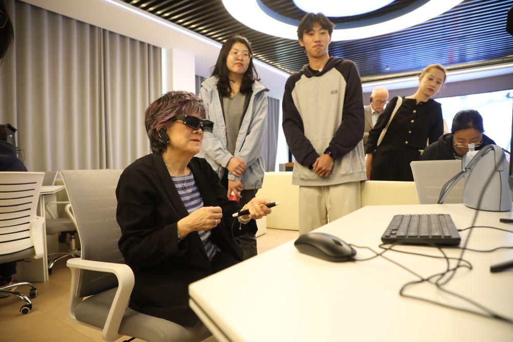 4月15日,在培黎職業(yè)學(xué)院,英中了解協(xié)會榮譽(yù)主席佐伊·里德體驗學(xué)生們親手設(shè)計搭建的虛擬現(xiàn)實場景模型。新華社記者 張智敏 攝