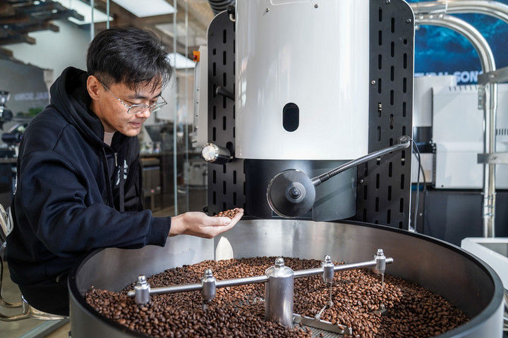 2025年12月10日,韓君瑋在位于昆明的南來(lái)盛咖啡店內(nèi)烘焙咖啡豆。