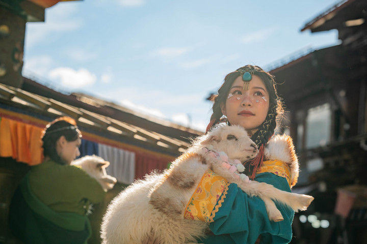 2023年3月8日,游客在迪慶州香格里拉市獨(dú)克宗古城拍照留念。