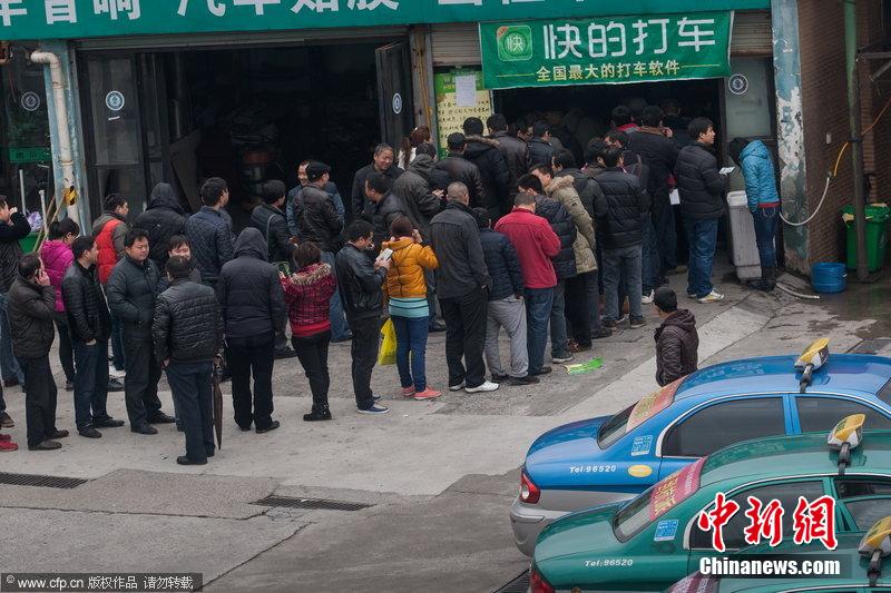 2014年2月19日,杭州“快的打車”服務點,出租車司機們排隊安裝軟件。圖片來源:CFP視覺中國