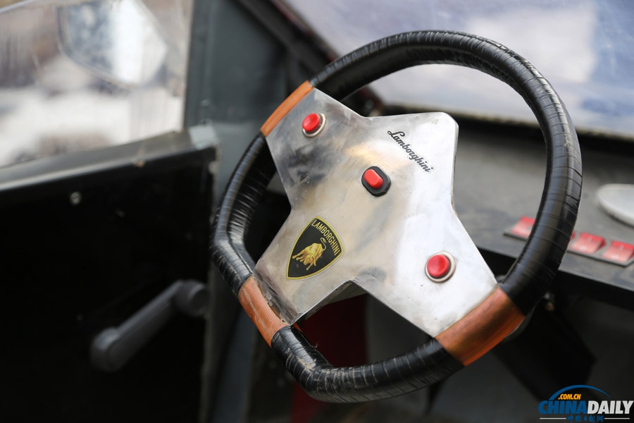 方向盤中部按鈕控制車子的前進、倒車。方向盤上的蘭博基尼標志是老郭在網(wǎng)上購買的。(侯建勛 攝)