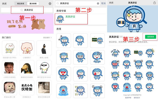 微信表情商店搜索“真真辟謠”,進(jìn)入表情專輯,點(diǎn)擊“使用表情”,即可使用。