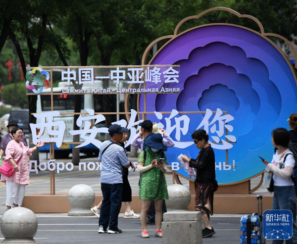 ↑5月16日,游客在西安市北大街上與中國-中亞峰會主題裝置合影。新華社記者 李一博 攝nwC安康新聞網(wǎng)