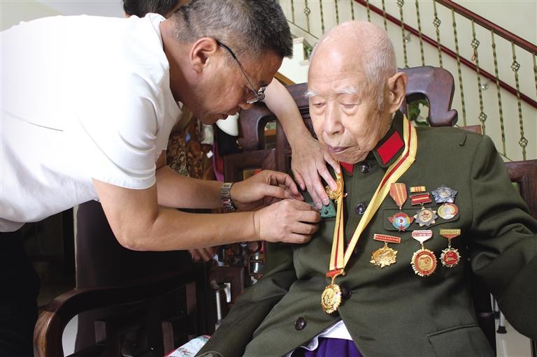 8月22日,99歲的我省抗戰(zhàn)老戰(zhàn)士劉炳榮佩戴國家頒發(fā)的“中國人民抗日戰(zhàn)爭勝利80周年”紀念章。 本報通訊員 吳寬宏攝5HQ安康新聞網(wǎng)