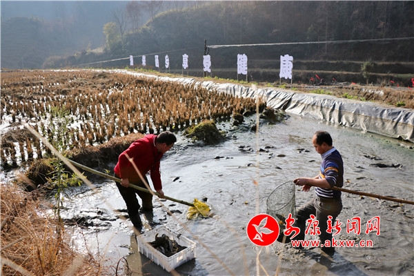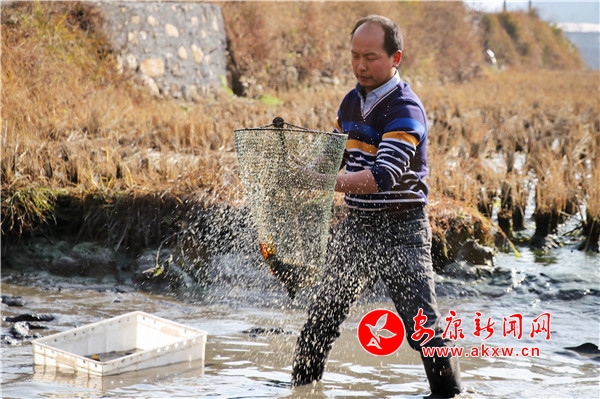 一大早,流芳村脫貧戶(hù)張遠(yuǎn)林一家就來(lái)到自家稻田撈魚(yú)。趕魚(yú)、撈魚(yú)、裝筐一氣呵成,他們要盡快把這些魚(yú)送到村里的收購(gòu)點(diǎn)。