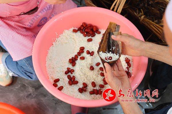 伴隨著一陣濃濃的糯米香撲鼻而來(lái),只見(jiàn)馬峰亮將筍殼粽葉疊放,彎成圓錐狀,抓起一撮泡好的糯米,填入本地紅豆沙,粽葉彎折捆扎后,一個(gè)有棱有角安康傳統(tǒng)豆沙粽就完成了。蒸煮兩個(gè)半小時(shí),剛出鍋的安康傳統(tǒng)手工粽,冒著騰騰的熱氣,剝開粽葉,一口下去,軟糯香甜、筋道拉絲,回味無(wú)窮。