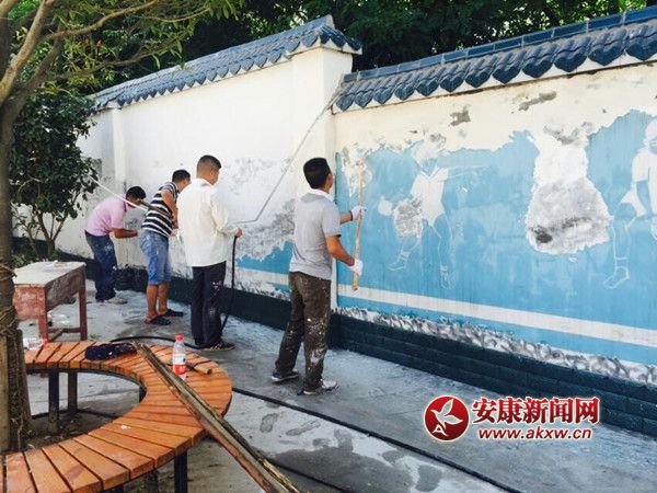 原來這是該校校園圍墻美化工程正在緊張的實施當中,盡管酷暑難當,但學校領導依然堅守崗位,工人師傅們更是揮汗如雨,認真細心地做好每一道工序。該校近年來校園基礎設施建設發(fā)生了顯著變化,特別是總面積達12畝的塑膠操場建成后,更是讓原本清新整潔的校園新增了一道亮麗的風景線。讓人感到美中不足的是原有500余米的圍墻墻面有些斑駁陳舊,學校積極爭取項目資金,并于7月4日正式開始對圍墻進行“美化”,秋季開學之際,重返校園的師生將會看到一扇扇嶄新的、充滿人文氣息的文化宣傳墻。