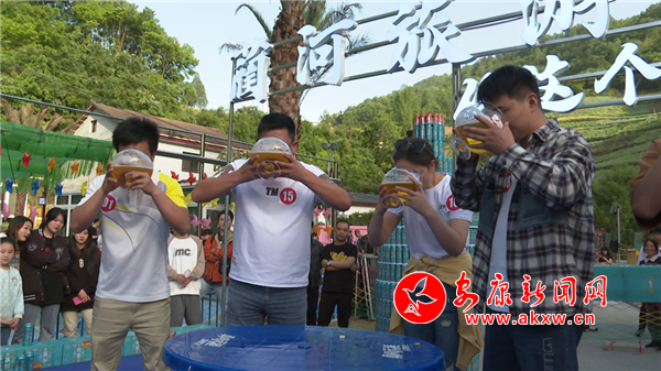 距離鄉(xiāng)愁館不遠(yuǎn)的摔碗酒比賽現(xiàn)場(chǎng)熱鬧非凡,一位身著地方特色服飾的村民與游客劃拳定輸贏,游客贏了便能免費(fèi)得到一壇嵐皋陳釀,游客輸了便要喝摔碗酒一碗,不管輸贏與否,都能引起在場(chǎng)群眾的陣陣歡笑。