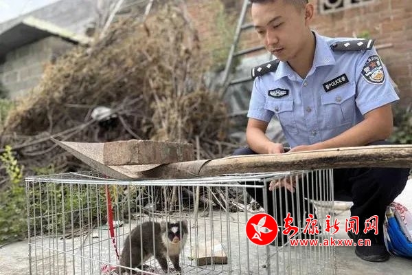 當(dāng)日中午,呂河派出所接到群眾報(bào)警稱,“在其家中鐵籠里關(guān)了一只像果子貍的野生動物,請求幫助。”接警后,值班民警迅速帶隊(duì)前往處置。到達(dá)現(xiàn)場后,民警看到了這只“不速之客”,是一只灰褐色皮毛的小動物,臉?biāo)坪焖曝i,花白面,時不時上躥下跳,身體狀況還不錯。民警經(jīng)過仔細(xì)比對和觀察,并經(jīng)林業(yè)部門工作人員確認(rèn),發(fā)現(xiàn)該動物并非果子貍,而是一只鼬獾,屬于國家三級保護(hù)動物。