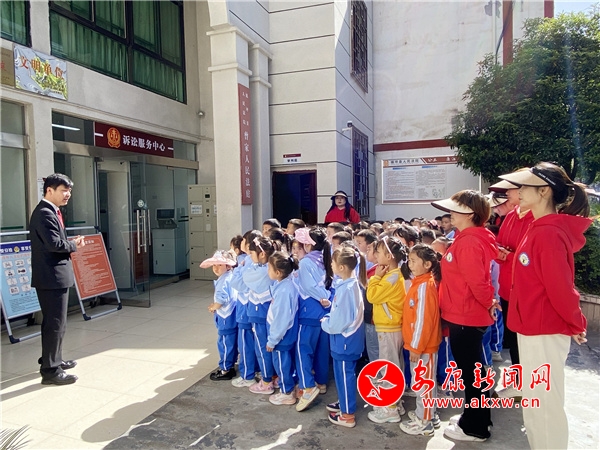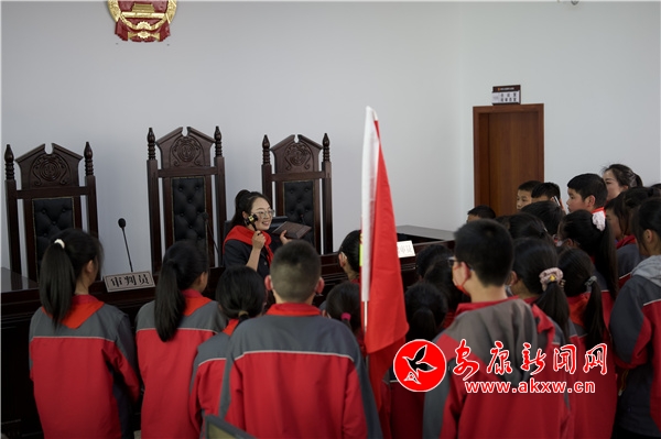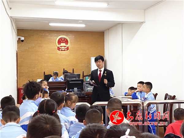 在參觀過程中,干警帶領同學們走進訴訟服務中心和干警辦公室了解了法院干警的工作場所。隨后,帶領同學們參觀審判庭,現(xiàn)場向同學們介紹科技審判法庭的功能及庭審流程,并展示了法袍、法槌和法徽,同時用深入淺出的語言和提問互動的方式向孩子們講解了法袍、法槌和法徽的象征意義,同學們興趣濃厚,紛紛走上審判臺,親身感受和觸摸審判設施,感受法庭審判的嚴肅和莊重。