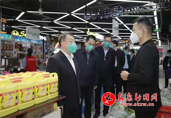 武文罡一行在紫陽縣城關(guān)鎮(zhèn)會仙橋社區(qū)萬友超市檢查生活物資供應(yīng)情況。記者 吳單 攝