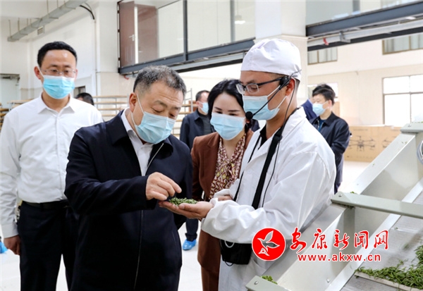 市長武文罡(左二)在長安鎮(zhèn)田珍茶業(yè)調研茶葉生產(chǎn)加工情況(攝影:李世鋒)