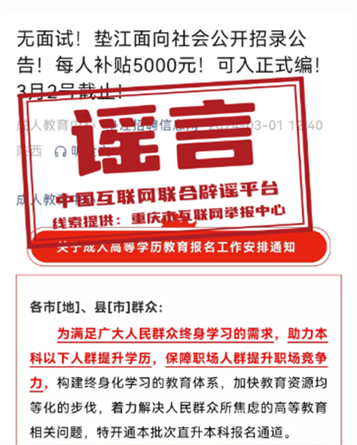 真相:近日,“墊江招聘信息網(wǎng)”微信公眾號(hào)發(fā)布信息:“無(wú)面試!重慶墊江面向社會(huì)公開(kāi)招錄公告!每人補(bǔ)貼5000元!可入正式編!”部分網(wǎng)民看到該信息后誤認(rèn)為,墊江面向社會(huì)以補(bǔ)貼形式招錄具有正式編制的公務(wù)人員,于是紛紛向墊江縣有關(guān)部門(mén)致電咨詢招錄情況。經(jīng)核實(shí),近年來(lái),墊江未曾以補(bǔ)貼方式和不經(jīng)過(guò)面試招錄具有正式編制公務(wù)人員。該信息實(shí)則為成人學(xué)歷提升培訓(xùn)信息,而非正式編制公務(wù)人員招錄信息。墊江縣互聯(lián)網(wǎng)信息辦公室已依法對(duì)發(fā)布該信息的微信公眾號(hào)負(fù)責(zé)人進(jìn)行約談和教育批評(píng),指出虛假信息的危害性,并責(zé)令刪除相關(guān)信息。(來(lái)源:重慶辟謠)