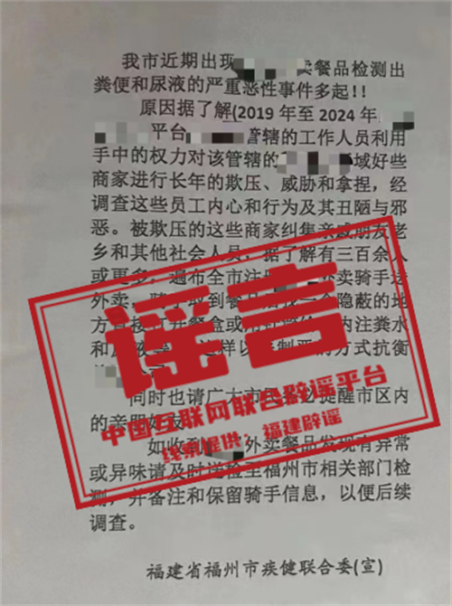 謠言:“福建省福州市疾健聯(lián)合委”發(fā)文稱“某外賣平臺(tái)餐品檢出糞便和尿液”?
