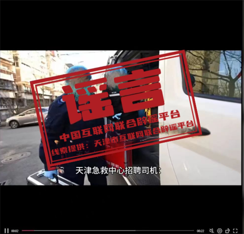 真相:近期,有網(wǎng)民在某短視頻平臺發(fā)布天津市急救中心救護車駕駛員招聘信息。經(jīng)核查,天津市急救中心近期沒有駕駛員招聘計劃,該信息不屬實,系網(wǎng)絡(luò)謠言。且該用戶在中心不知情情況下擅自利用中心員工工作照片進行虛假宣傳,造成惡劣影響。(來源:“天津辟謠”微信公眾號)