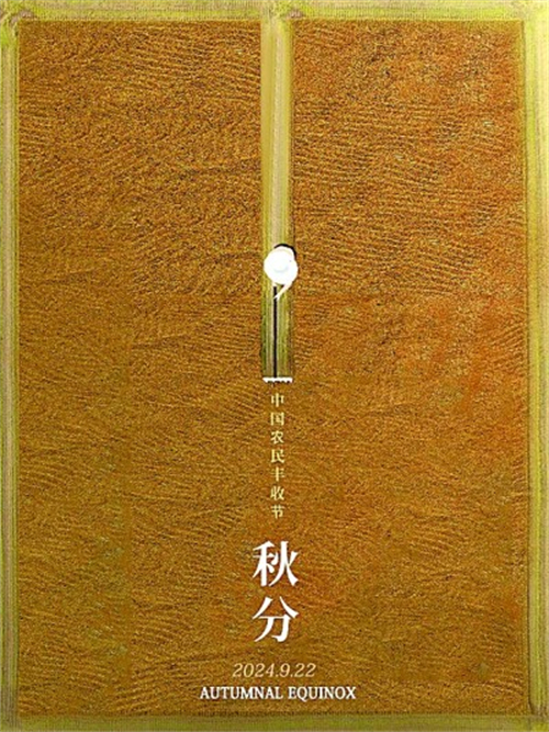 秋分時節(jié),是農(nóng)作物豐收的重要季節(jié),田間地頭一派農(nóng)忙景象。自2018年起,我國將每年秋分設(shè)立為“中國農(nóng)民豐收節(jié)”,圖④作品即聚焦這一主題,整體采用俯視角度,畫面中央一名農(nóng)民正在稻田中勞動,稻田的金黃顏色象征著豐收與希望,充滿視覺沖擊力,展現(xiàn)出大地滿載收獲的美好景象。