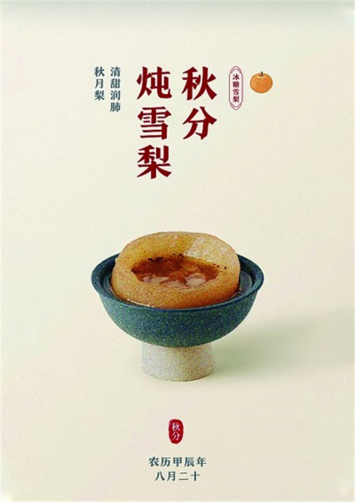 秋風漸起,寒涼氣息加重。秋分時節(jié)在飲食調(diào)養(yǎng)方面,應多喝水,吃清潤的食物。圖⑦設(shè)計的中心元素是冰糖燉雪梨,象征秋季的清潤與養(yǎng)生,也暗示了秋分時節(jié)陰陽調(diào)和、天地平衡的自然哲理。