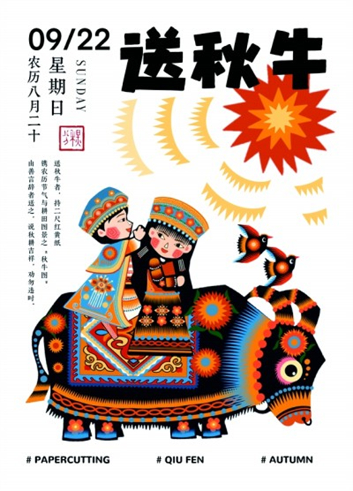 秋分是一個重要的農(nóng)業(yè)節(jié)氣,也是中國傳統(tǒng)文化中的重要時刻,民間很重視秋分節(jié)氣,有著各種秋分習俗。例如“送秋牛”,一般在紅紙或黃紙上畫農(nóng)夫耕田圖樣,再印上全年農(nóng)歷節(jié)氣情況,送圖者都是些民間善言唱者,主要說些秋耕吉祥、不違農(nóng)時的話。圖③借用工藝美術(shù)家?guī)焓缣m的剪紙作品形式,將其基本圖形進行組合再創(chuàng)作,配色選用橙黃為主、藍色為輔,顯得既貼近傳統(tǒng),又生動有趣。