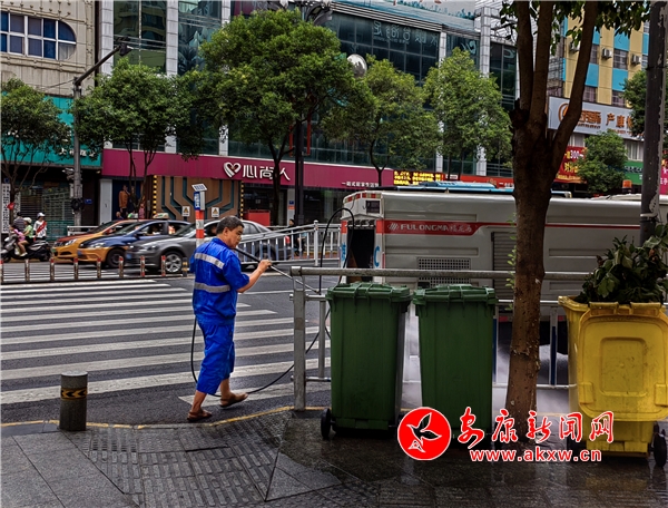 環(huán)衛(wèi)工人清洗垃圾桶、人行道