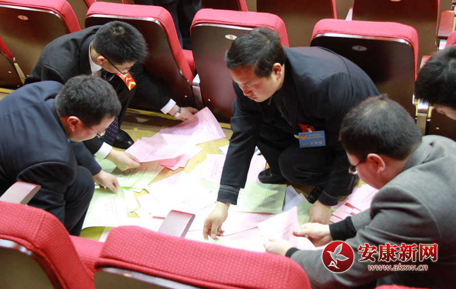 大會(huì)工作人員現(xiàn)場(chǎng)對(duì)投票進(jìn)行統(tǒng)計(jì)