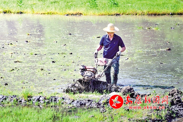 5月1日,石泉縣城關(guān)鎮(zhèn)絲銀壩村百畝水田里,農(nóng)戶操作旋耕機(jī)做好插秧前的各項(xiàng)準(zhǔn)備工作。董長松 攝