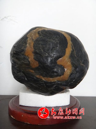 此石為漢江水墨石,亦稱金帶石,石長22㎝、寬20㎝、高16㎝.石形完整,色彩對比明顯,頭像輪廓比例協(xié)調(diào),人物五官清晰可見,面部表情呈沉思狀,尤以“魯迅”先生標(biāo)志性小寸發(fā)和八字胡最為傳神,令人嘆為觀止!