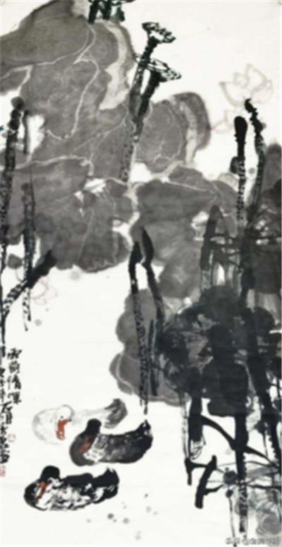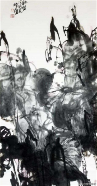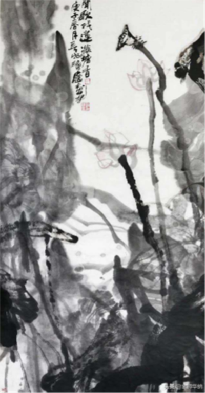 其中,《風搖荷花聽雨聲》這幅國畫作品令我記憶尤深,畫面尺寸為 180×96 厘米,整幅畫采用寫意手法,虛實相生,荷葉由近及遠,由實到虛,畫面色調(diào)以黑白為主,簡約又包容萬物,墨色濃淡有致,筆法干脆利落,含蓄中帶著一股蓄勢待發(fā)的張力,構圖飽滿,幾片荷葉占據(jù)了畫面的主要部分,在荷葉群中不時穿插幾朵荷花、蓮藕,荷葉的輪廓從前至后,由清晰至模糊,營造了一種水汽氤氳感,荷花隨風擺動,遠處的荷葉似乎和水面渾然融為一體的畫面,荷花與水色天光互為襯托,靈動生機,畫家將荷花人格化,以荷言志,贊賞荷花在雨中傲然挺立的高潔風骨,憐惜荷花飽受風雨的摧殘,以此為畫面精神支點,物我合一,從自然界植物的角度感受世間百態(tài),看著這幅畫,仿佛置身煙雨迷離,以游人眼光靜靜觀賞荷花搖曳之姿,在水墨流動中,體味傳統(tǒng)審美意象之氣脈,感受荷花的“出淤泥而不染,濯清漣而不妖”的淡泊雅致……
