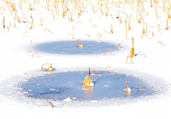 我的攝影創(chuàng)作圍繞生命的痕跡、時(shí)間的隱喻兩個(gè)主題。在《嘉實(shí)擷芳·野圃瑤音》中,菜園的微觀生態(tài)被賦予交響樂(lè)般的節(jié)奏——葫蘆藤的螺旋曲線是生命的律動(dòng),西紅柿根莖的垂直排列是生長(zhǎng)的秩序,蚜蟲(chóng)蝕痕的細(xì)節(jié)則暗喻生態(tài)的共生與抗?fàn)帯6凇冻武翳?middot;沙月溯光》里,榮成海岸的冬夏對(duì)比成為時(shí)間的隱喻,結(jié)冰湖面上的凋敗蓮蓬是流逝凝固的時(shí)光,夏日海邊的金色水洼則是流動(dòng)的永恒。我癡迷于捕捉這種矛盾與共生——就像用冷暖色調(diào)碰撞出畫(huà)面的張力,也用虛實(shí)構(gòu)圖處理每一張照片,期待每一張照片是個(gè)性鮮明,讓人耳目一新。
