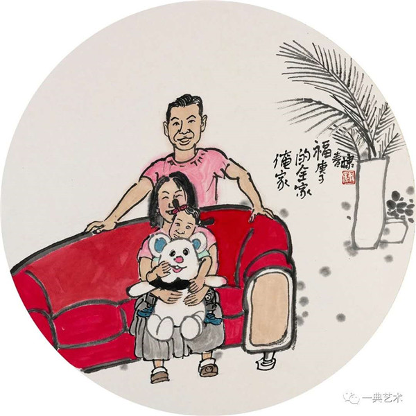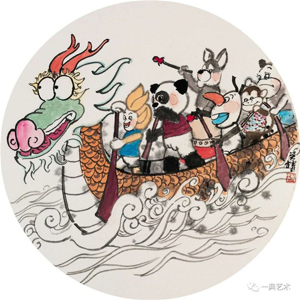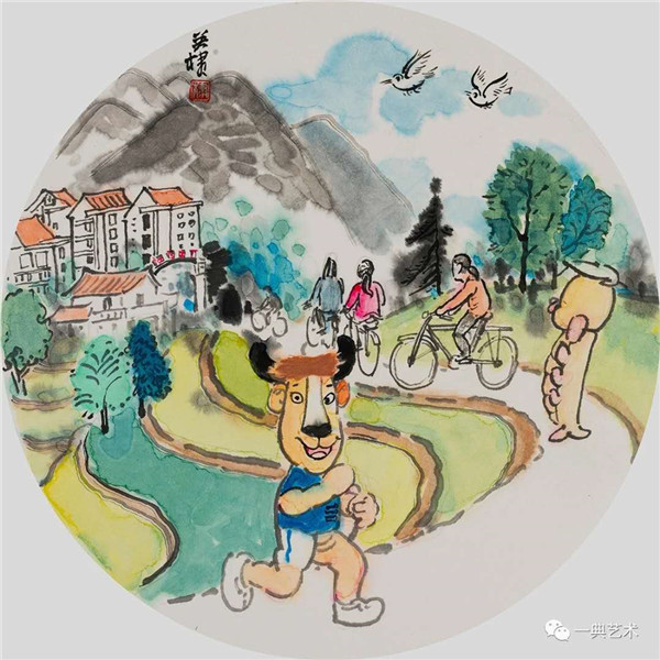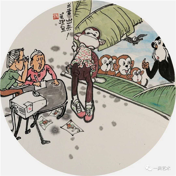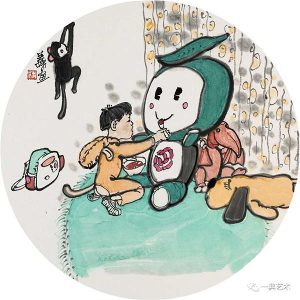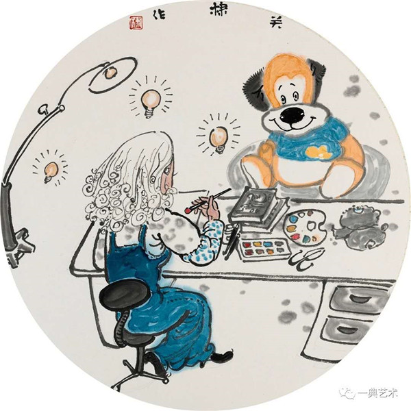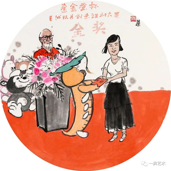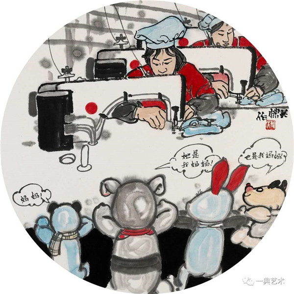 創(chuàng)作這個(gè)題材,我思考的內(nèi)容是豐富的,表達(dá)方式是明晰的,創(chuàng)作沖動(dòng)是豐沛的。在初期,當(dāng)沒(méi)有門徑的時(shí)候,曾經(jīng)請(qǐng)人社局根據(jù)文字資料“劃重點(diǎn)”,而人社局領(lǐng)導(dǎo)給了很寬泛的態(tài)度:沒(méi)有重點(diǎn),只要和毛絨玩具相關(guān)。這一態(tài)度實(shí)際上解放了我的思想,放開了我的手腳:尋求有約束的自由——給以充分自由——自我追尋“有約束”的自由。好吧,自己給自己尋找方向!考察結(jié)束,創(chuàng)作方向已經(jīng)確定:以人和毛絨玩具作為主要表現(xiàn)內(nèi)容,以中國(guó)水(彩)墨畫為形式。在那幾天(直至今日)我頭腦里充斥著毛絨玩具和女工的形象,兩者形異神同,就像《西游記》中人神共處。因此,創(chuàng)作中我將人和物都以“人”的精神面貌進(jìn)行刻畫,為了藝術(shù)語(yǔ)言的統(tǒng)一,將人略作夸張,并力求“以形寫神”“形神兼?zhèn)?rdquo;,并設(shè)定一定情節(jié)性、趣味性。實(shí)際上毛絨玩具在設(shè)計(jì)過(guò)程中,應(yīng)該是運(yùn)用了文學(xué)領(lǐng)域的比喻、比擬、夸張、類比、通感等修辭手法,這也是我在創(chuàng)作中經(jīng)常用到的手法。我是一個(gè)中國(guó)畫家,因此作品強(qiáng)調(diào)中國(guó)畫的意蘊(yùn),任何時(shí)候,不忽略筆墨的表現(xiàn)。為了符合這個(gè)產(chǎn)品的特性(裝飾性、時(shí)尚性),我有意識(shí)吸取了一些水彩畫的表現(xiàn)語(yǔ)言。無(wú)論從思想上、技法上,不脫節(jié)傳統(tǒng)、不疏離當(dāng)代。這種表現(xiàn),(也許)增加了作品的藝術(shù)性。