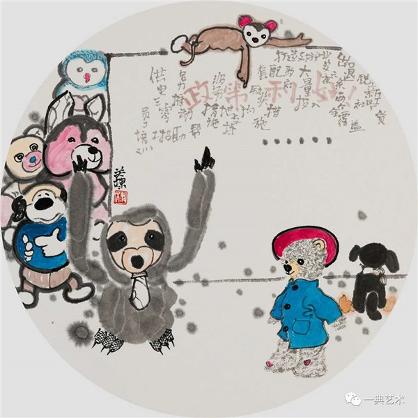 對(duì)于政策性的以及企業(yè)生產(chǎn)經(jīng)營(yíng)活動(dòng),在這批作品中也有一定的表現(xiàn)。表現(xiàn)這種內(nèi)容是有難度的。創(chuàng)作中,我設(shè)定了毛絨玩具與政策的“互動(dòng)”:譬如,我在一幅畫中,一群玩具的背影在觀看“安康六條”,而“安康六條”的縫隙,畫了許多活潑淘氣的玩具,透露出毛絨玩具產(chǎn)業(yè)的興旺發(fā)達(dá)。另一幅是一些毛絨玩具在好奇地觀看“看板”上的各種支持政策,一個(gè)調(diào)皮的猴子趴在看板頂頭給大家講解政策,擬人化、趣味性、含蓄、有情境,應(yīng)該解決了這類“難題”。